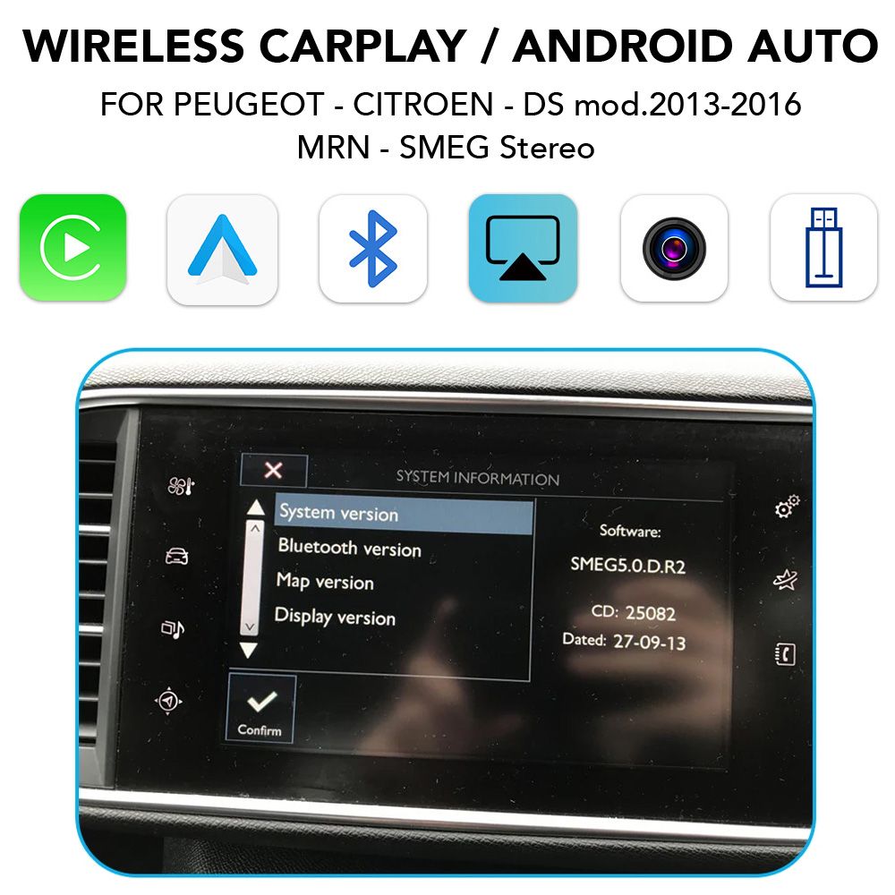Interface Box για ασύρματο Apple Car Play, Android Auto, Screen Mirrorink, Bluetooth, USB Player & Κάμερα, συμβατό με MRN – SMEG Stereo με Software: SMEG5.0.D.R2 και οθόνη 7″, για αυτοκίνητα Peugeot – Citroen – DS 2013-2016, διατηρώντας όλες τις εργοστασιακές ενδείξεις του ηχοσυστήματος στην οθόνη του αυτοκινήτου με πλήρη ενσωμάτωση των εργοστασιακών χειριστήριων του αυτοκινήτου.